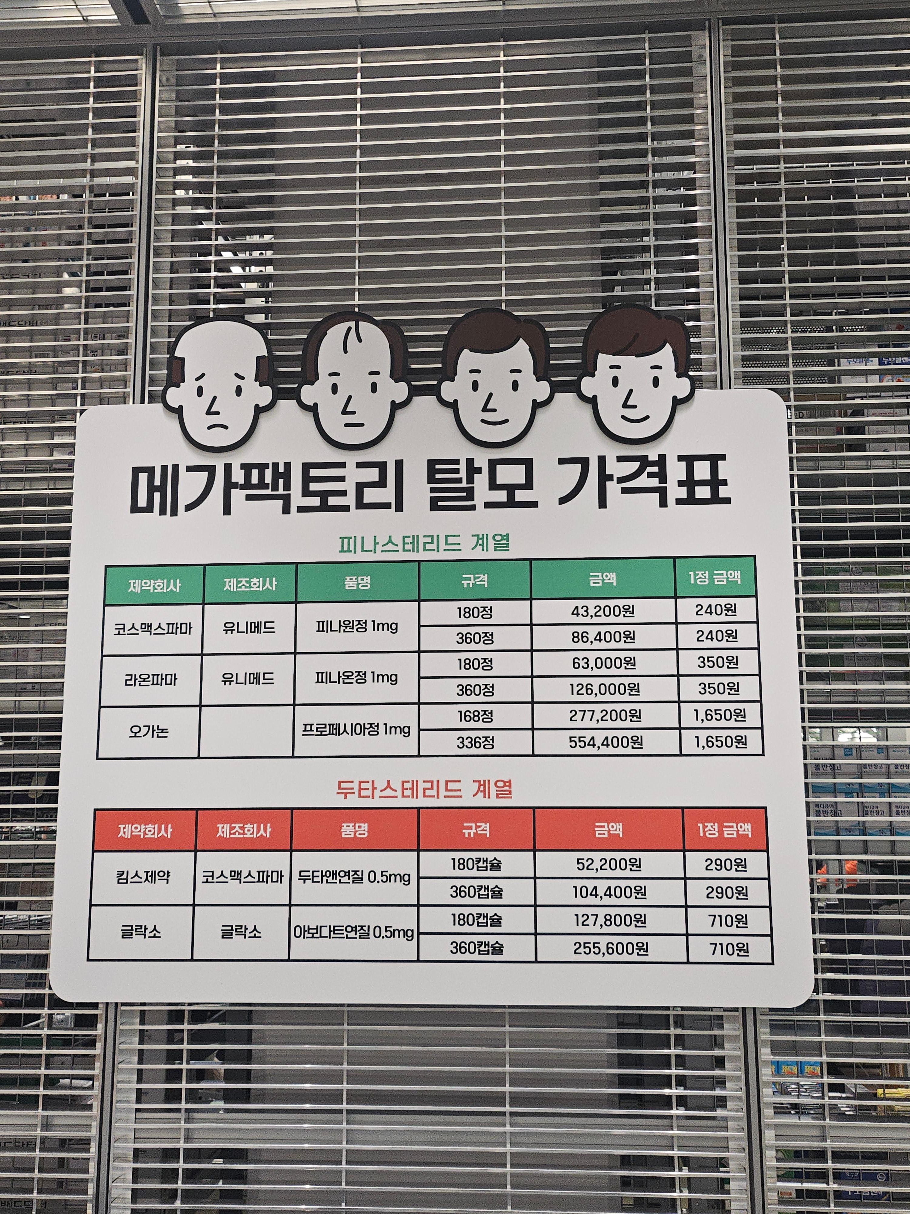 입구 왼편의 조제실에서는 같은 건물에 입점한 병원의 처방전을 가져가면 조제해 주고, 탈모약도 조제해 준다고 합니다. 탈모 가격표가 전시되어 있어요.