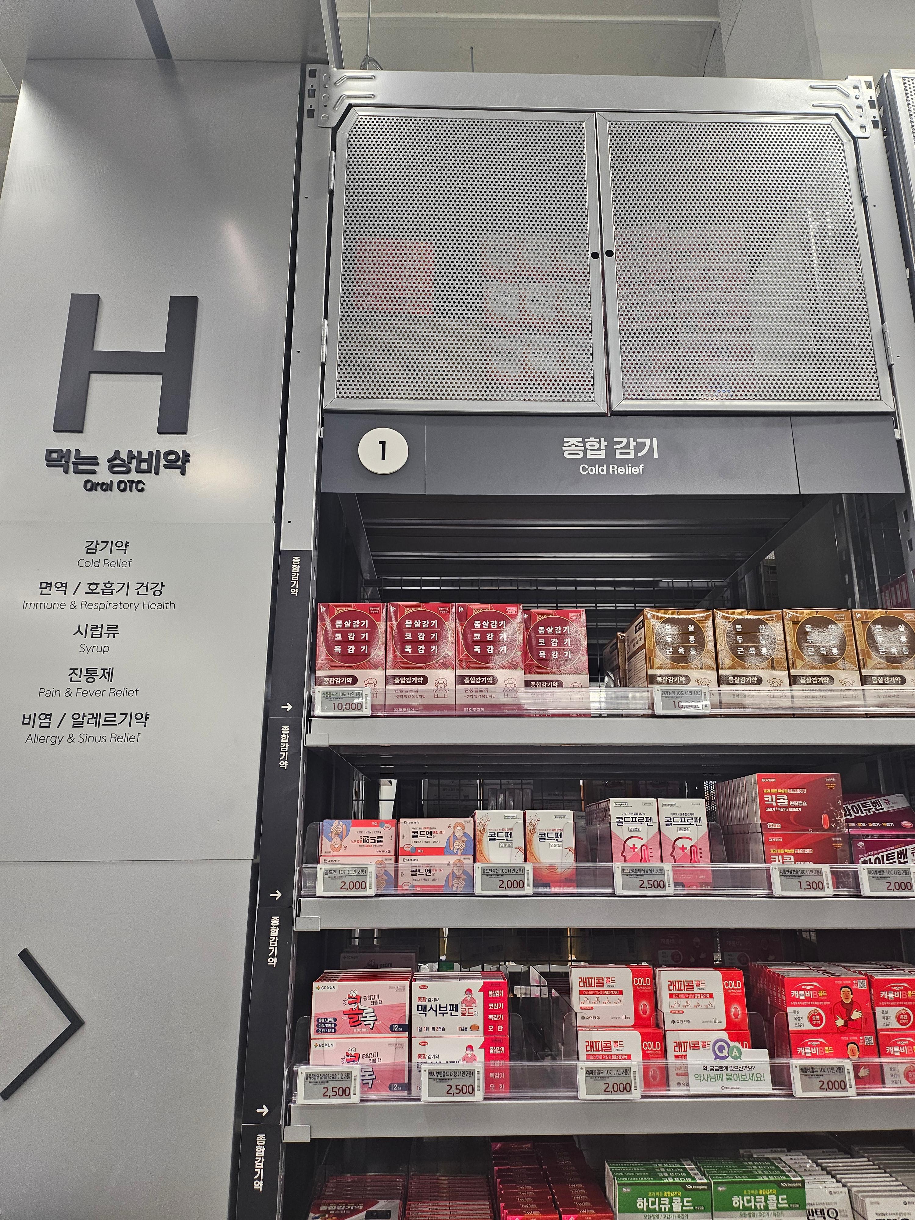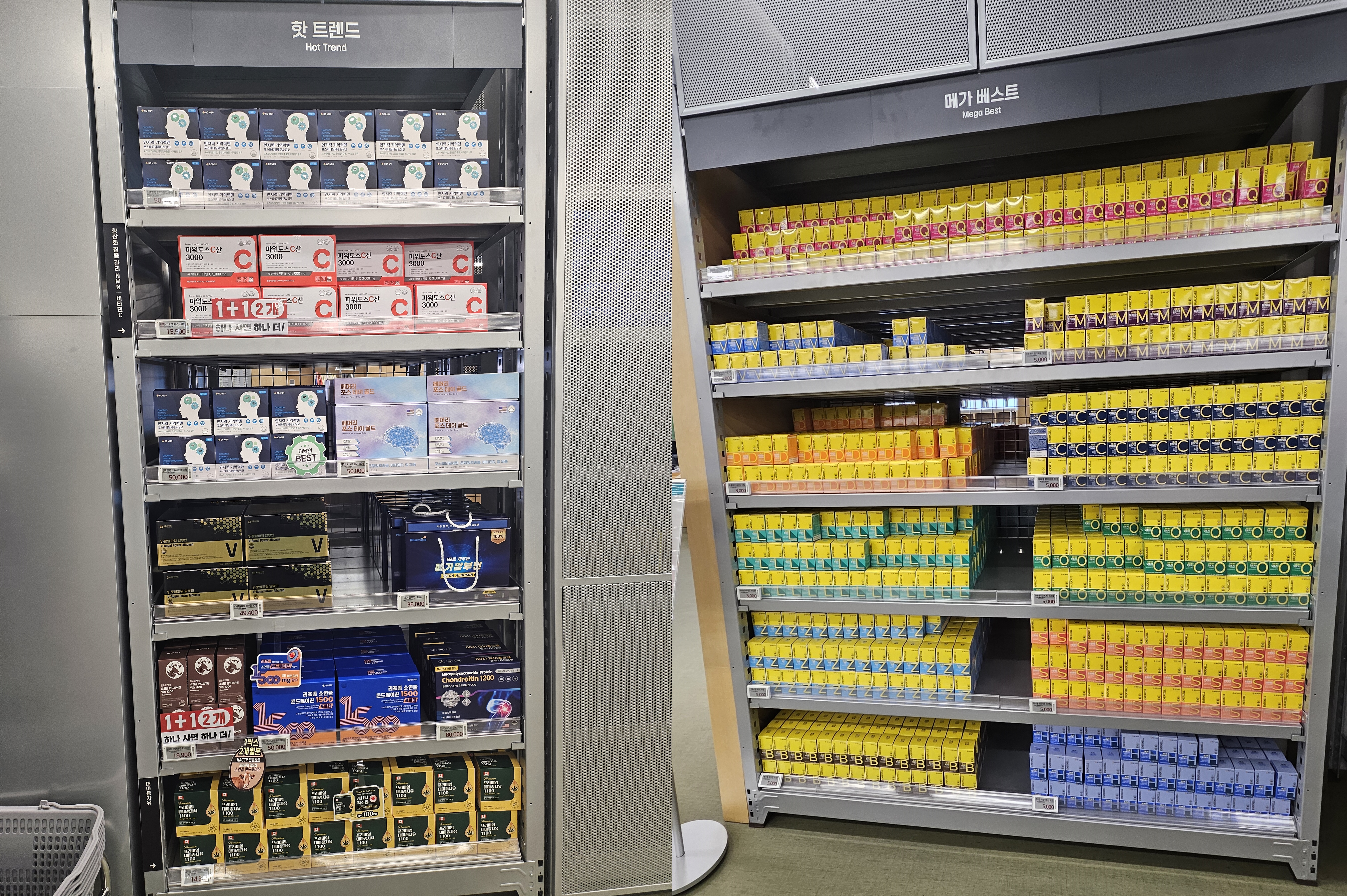 매장이 넓고 카테고리별로 구역이 잘 나뉘어 있고, 일반의약품 뿐만 아니라 건강기능식품, 화장품, 의료기기, 반려동물을 위한 약품과 용품까지 다양한 상품들이 전시되어 있어요.